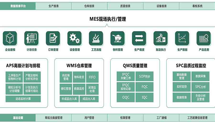 包含工單管理、計劃管理、生產(chǎn)執(zhí)行、物料管理、設(shè)備管理、質(zhì)量管理、安燈管理、模治具管理等核心模塊。